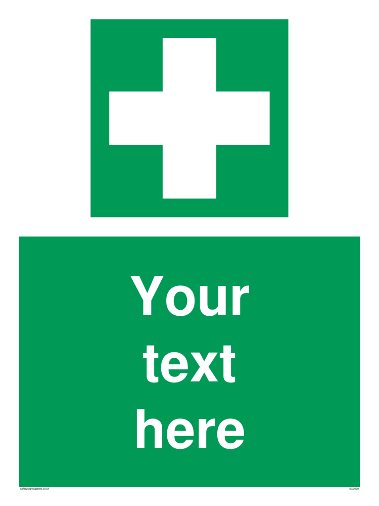 This sign contains a first aid symbol - universal first aid cross in white on green background.