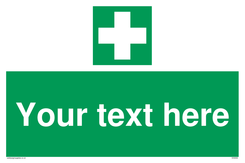 This sign contains a first aid symbol - universal first aid cross in white on green background.