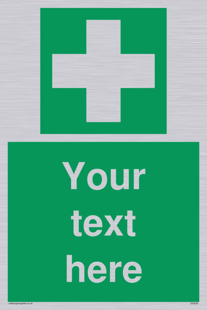 This sign contains a first aid symbol - universal first aid cross in white on green background.