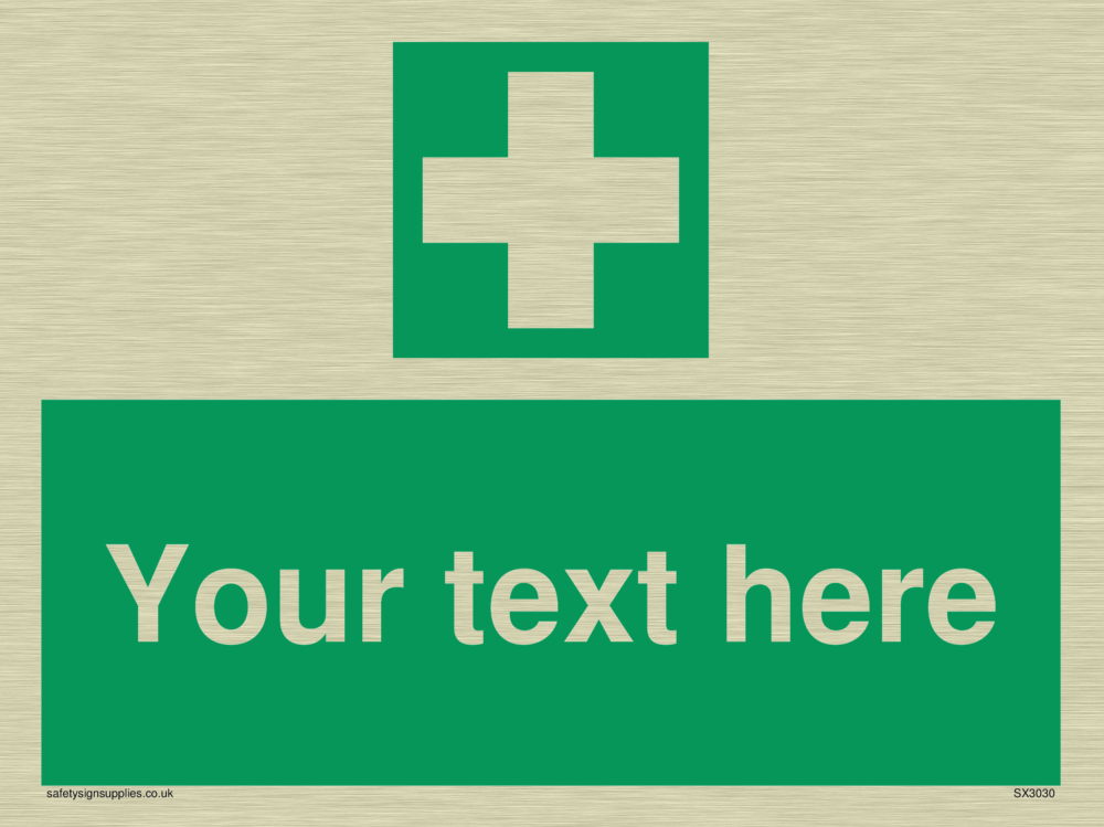 This sign contains a first aid symbol - universal first aid cross in white on green background.