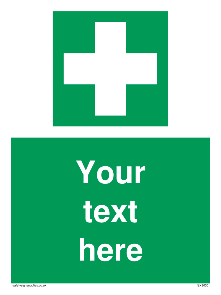 This sign contains a first aid symbol - universal first aid cross in white on green background.