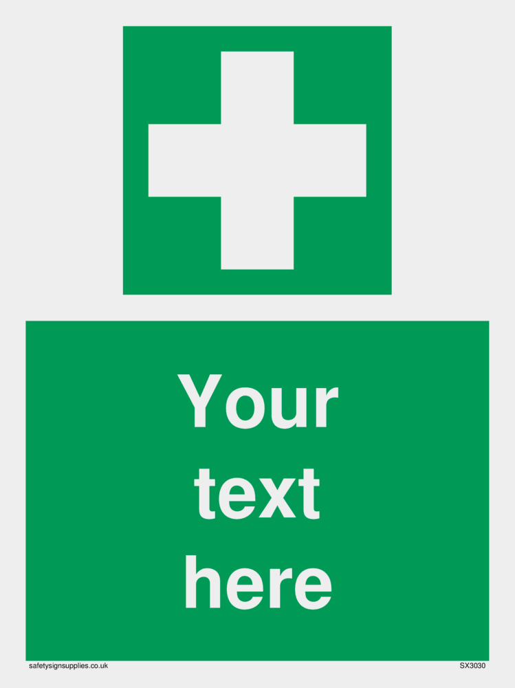 This sign contains a first aid symbol - universal first aid cross in white on green background.