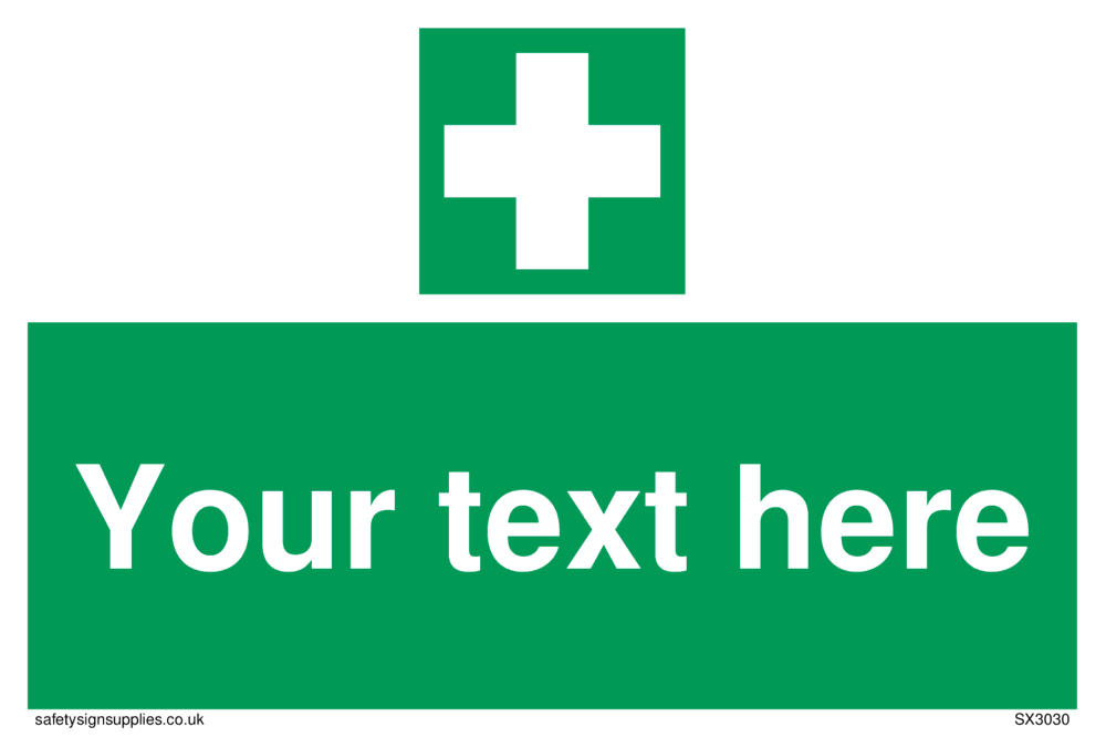 This sign contains a first aid symbol - universal first aid cross in white on green background.