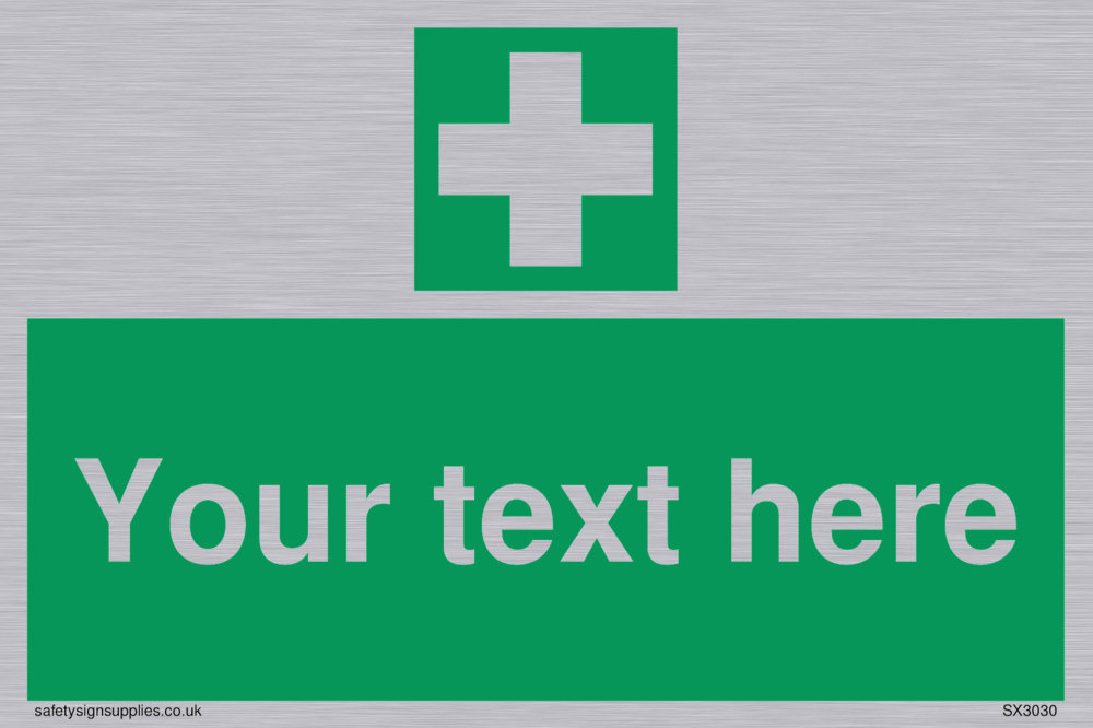 This sign contains a first aid symbol - universal first aid cross in white on green background.