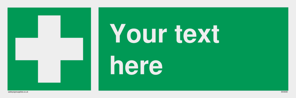 This sign contains a first aid symbol - universal first aid cross in white on green background.
