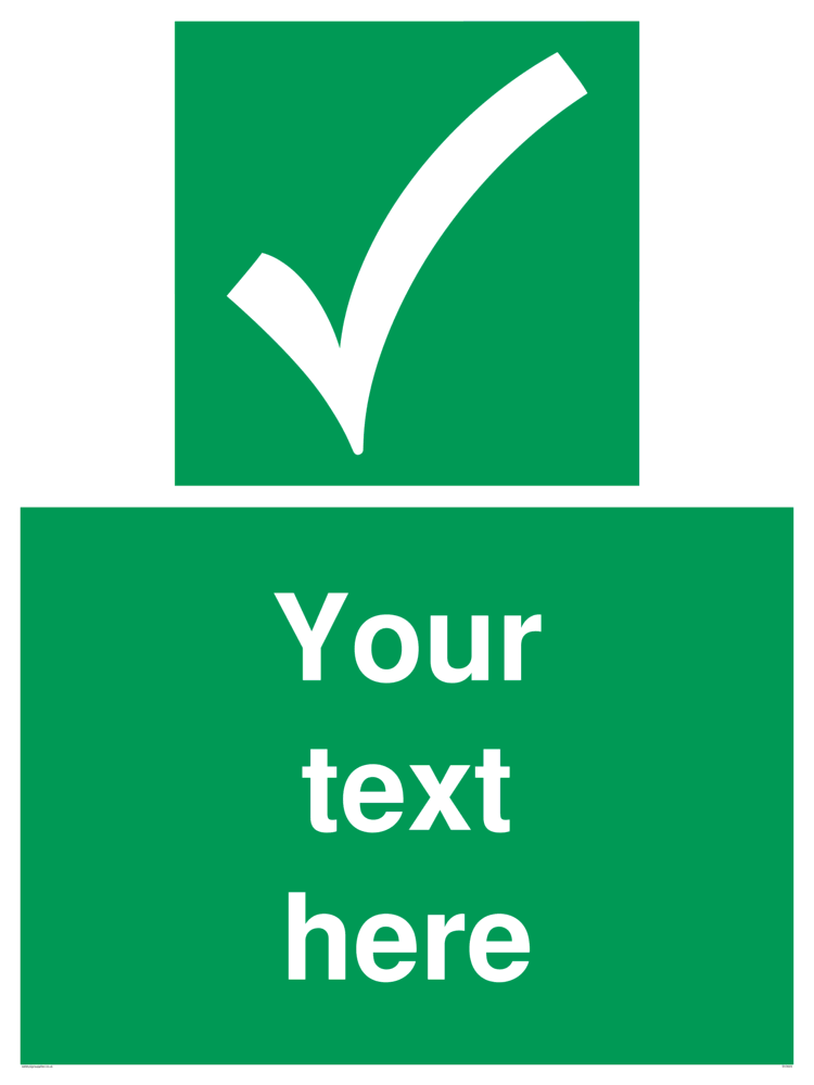 This sign contains a general Safe Condition Symbol - white tick on green background. Comes with a self adhesive backing. 800mm or approximately 32" high.