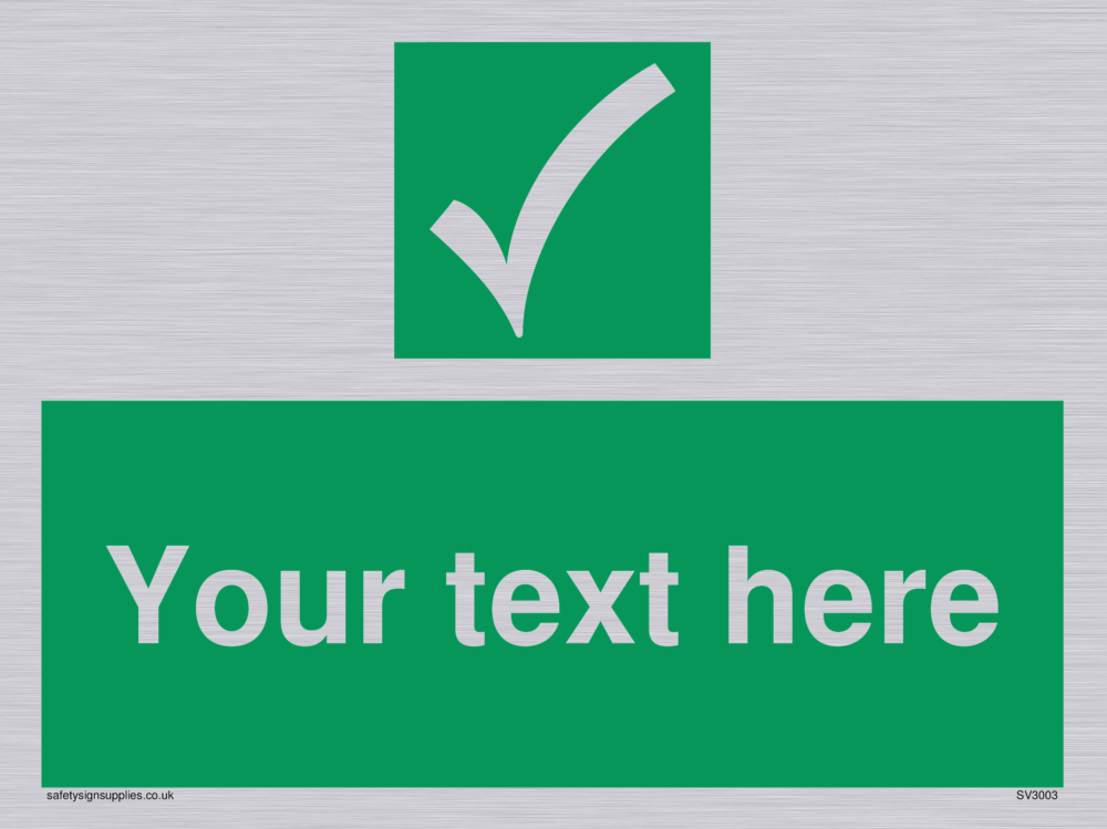 This sign contains a general Safe Condition Symbol - white tick on green background. Comes with a self adhesive backing. 150mm or approximately 6" high.