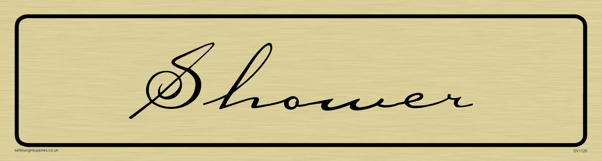 "architectural - shower door sign with brushed metal finish / background, text in positive, black font - caramel"