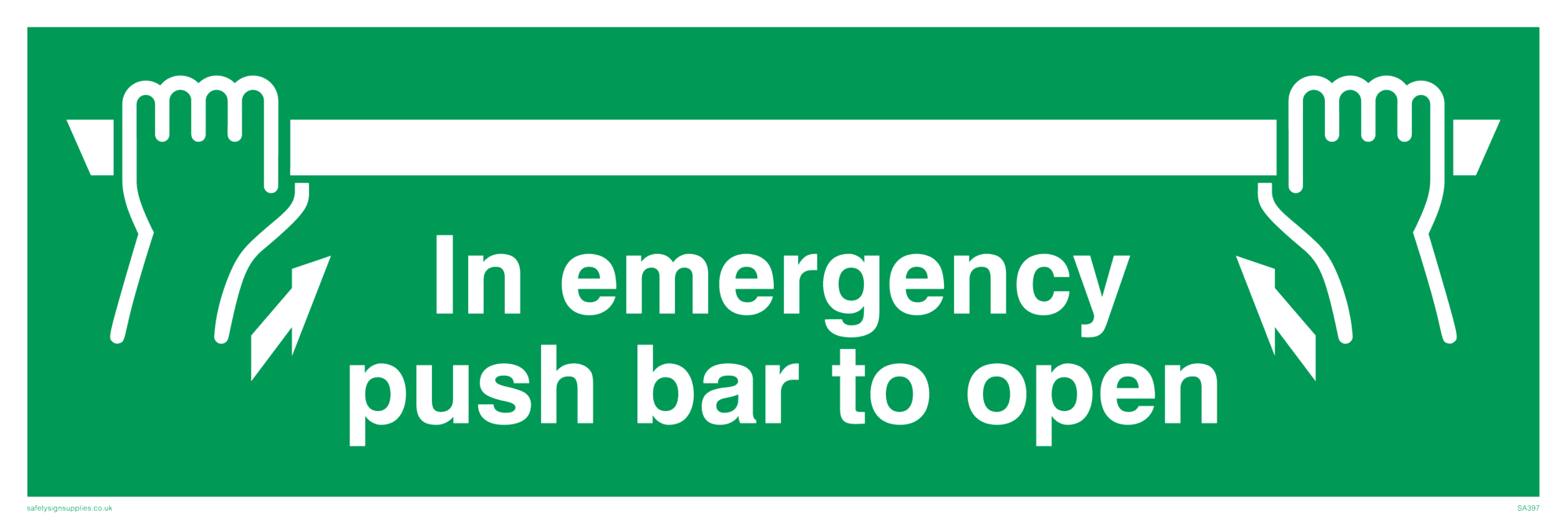 This sign contains a push /pull to open symbol - hand pushing or pulling bar with arrow in white on green background. Comes with a self adhesive backing.