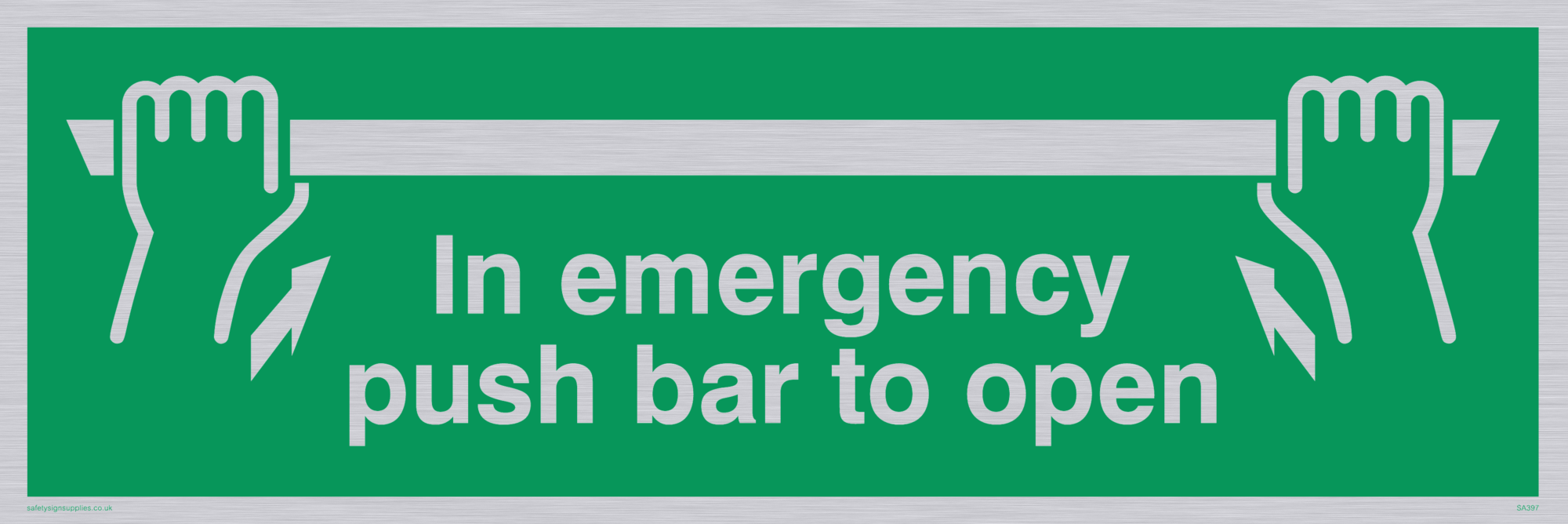 This sign contains a push /pull to open symbol - hand pushing or pulling bar with arrow in white on green background.