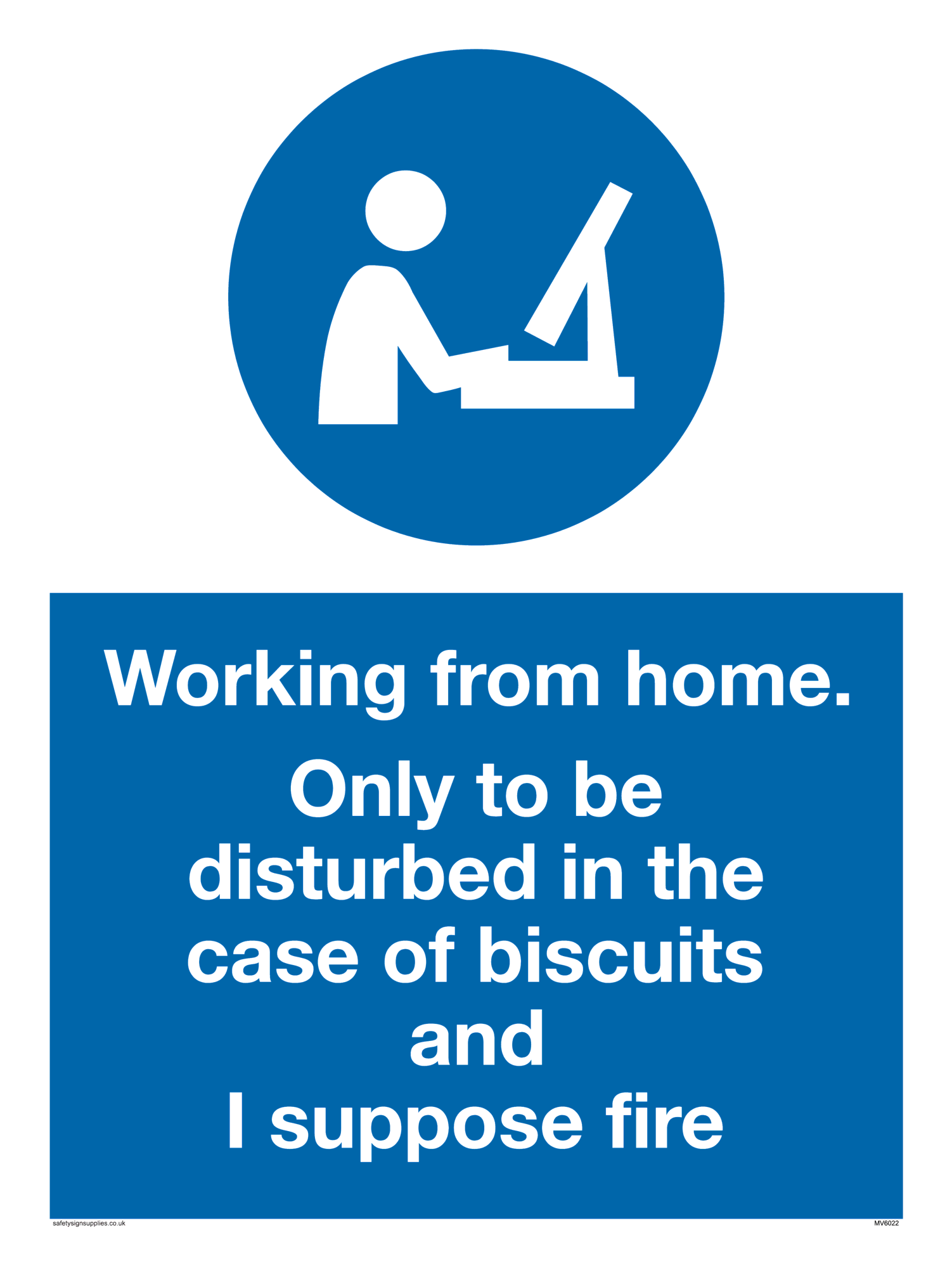Sign Text: Working from home. Only to be disturbed in the case of biscuits and I suppose fire