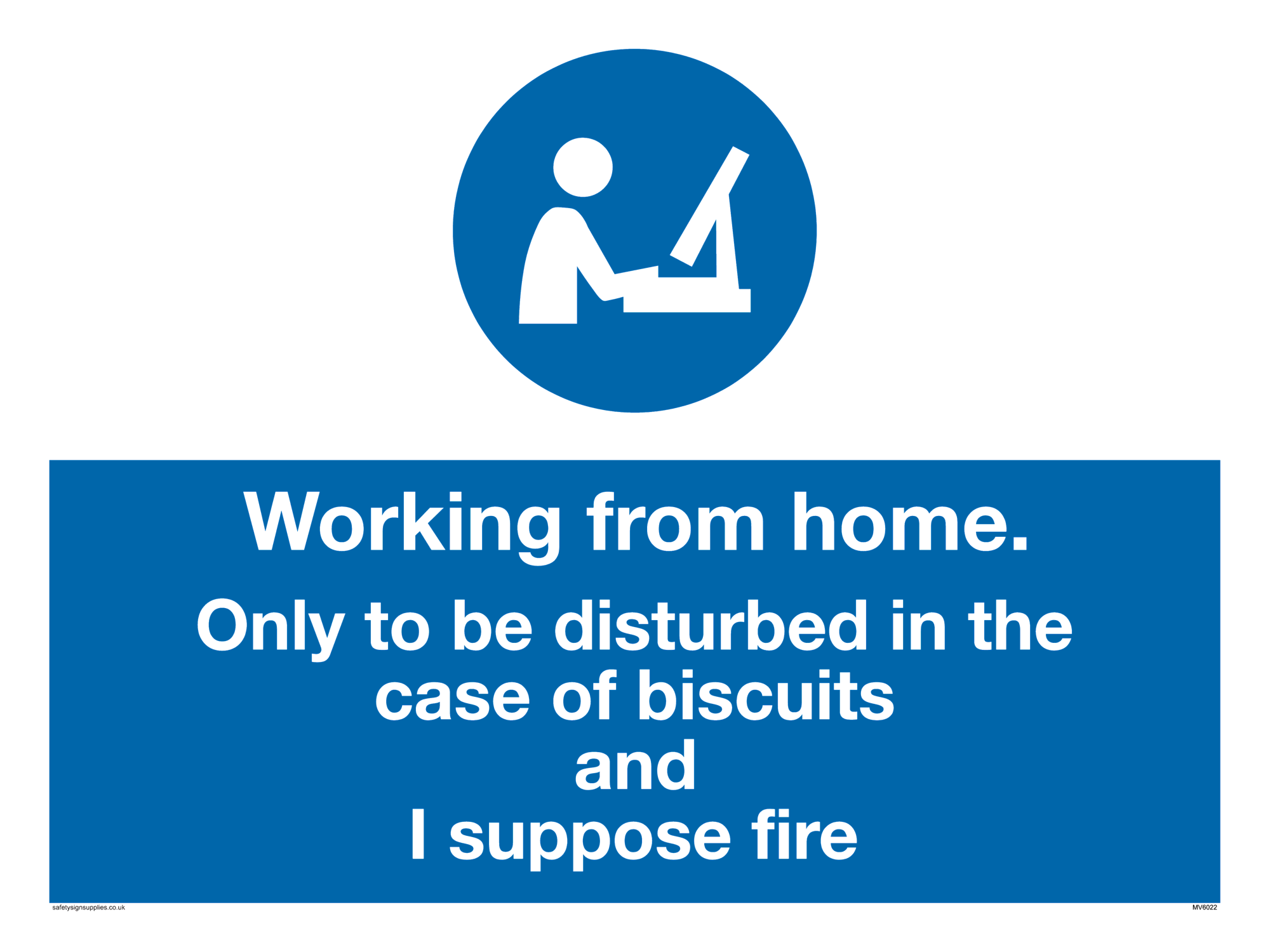 Sign Text: Working from home. Only to be disturbed in the case of biscuits and I suppose fire
