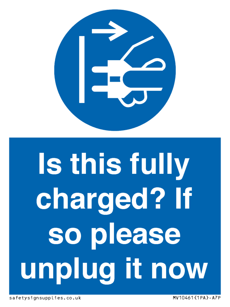Is this fully charged? If so please unplug it now Sign