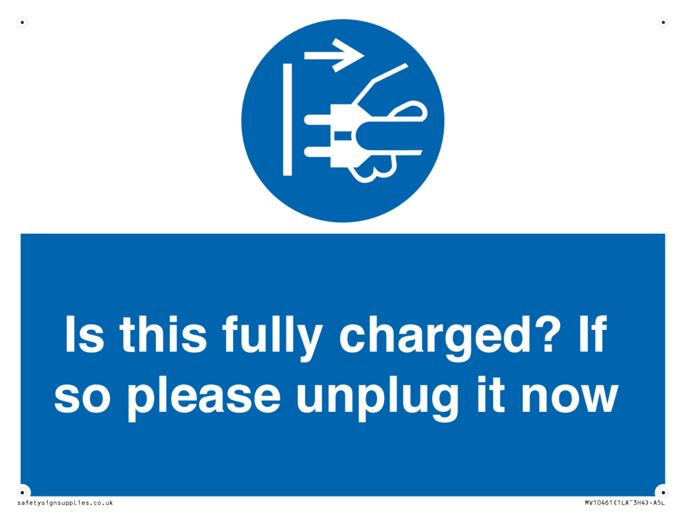 Is this fully charged? If so please unplug it now Sign