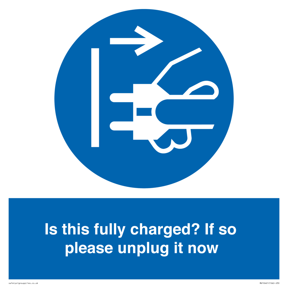 Is this fully charged? If so please unplug it now Sign