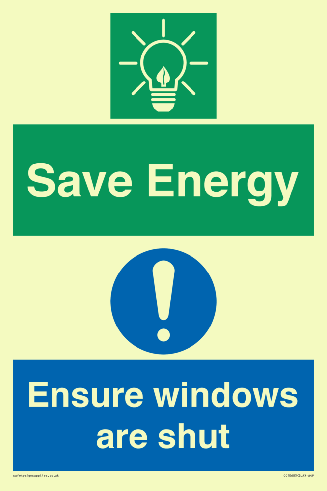 Save energy. Ensure windows are shut Sign