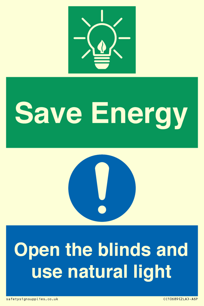 Save Energy open the blinds and use natural light Sign
