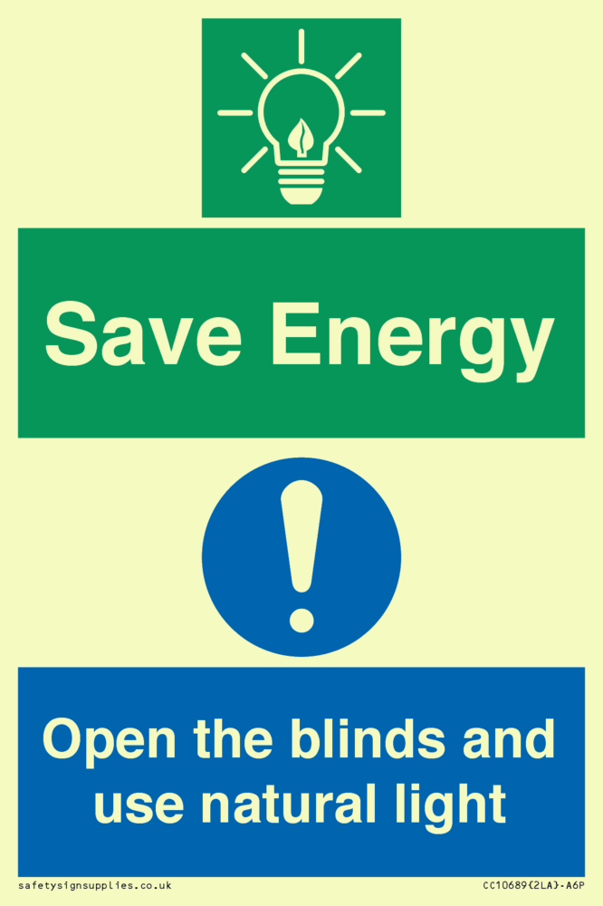 Save Energy open the blinds and use natural light Sign