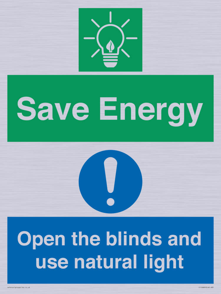 Save Energy open the blinds and use natural light Sign