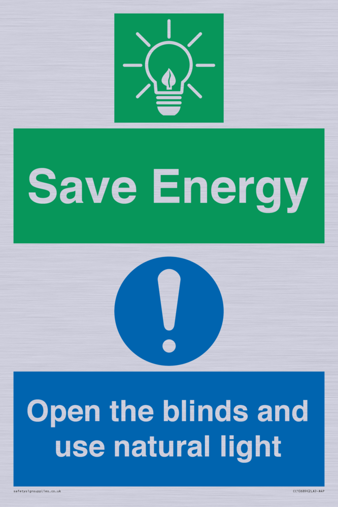 Save Energy open the blinds and use natural light Sign