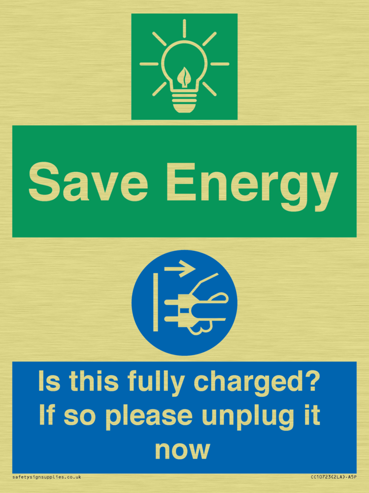 Save Energy - Is this fully charged? If so please unplug it now Sign