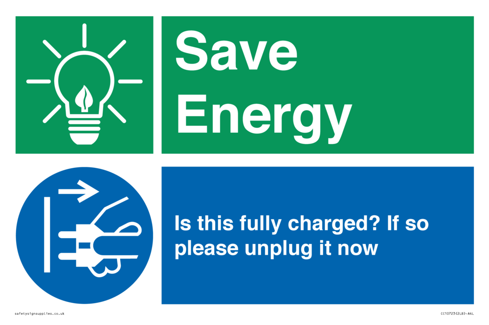 Save Energy - Is this fully charged? If so please unplug it now Sign