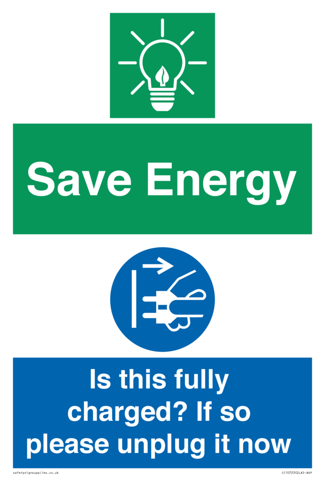 Save Energy - Is this fully charged? If so please unplug it now Sign