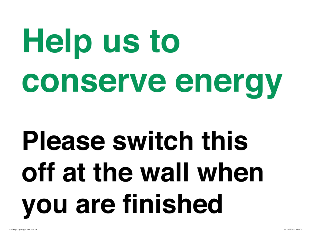 Help us to conserve energy - Please switch this off at the wall when you are finished Sign