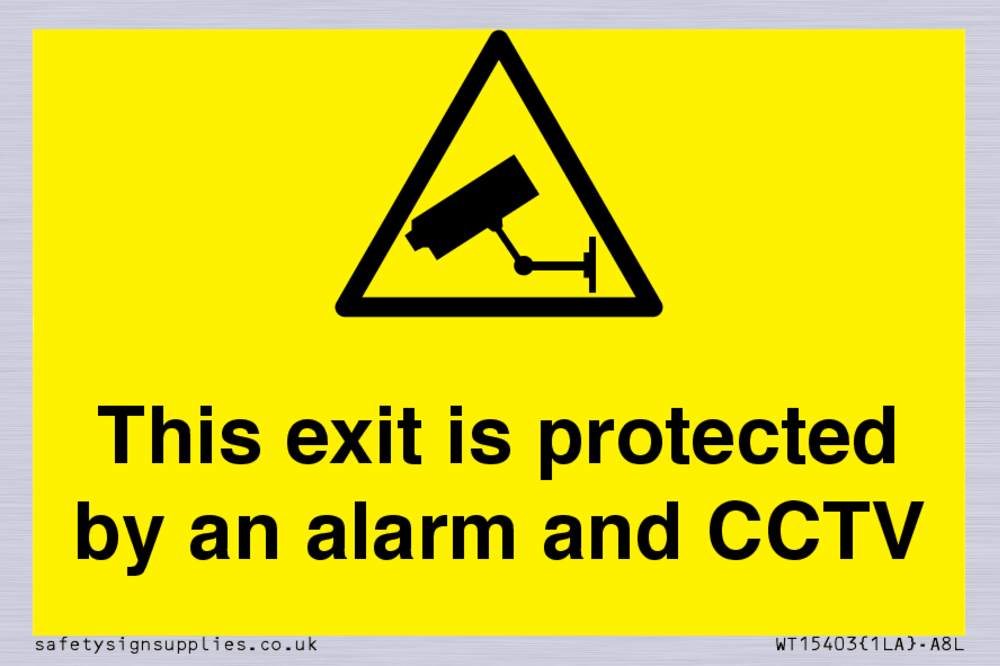 Sign Text: This exit is protected by an alarm and CCTV Dimensions: 75x50mm Material: Plastic Semi-rigid Silver Orientation: Landscape Text Colour: White Background Colour: Yellow More...