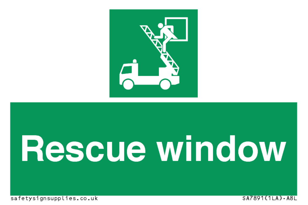 This sign contains an emergency escape ladder symbol - figure climbing out a window onto a ladder in white on green background.