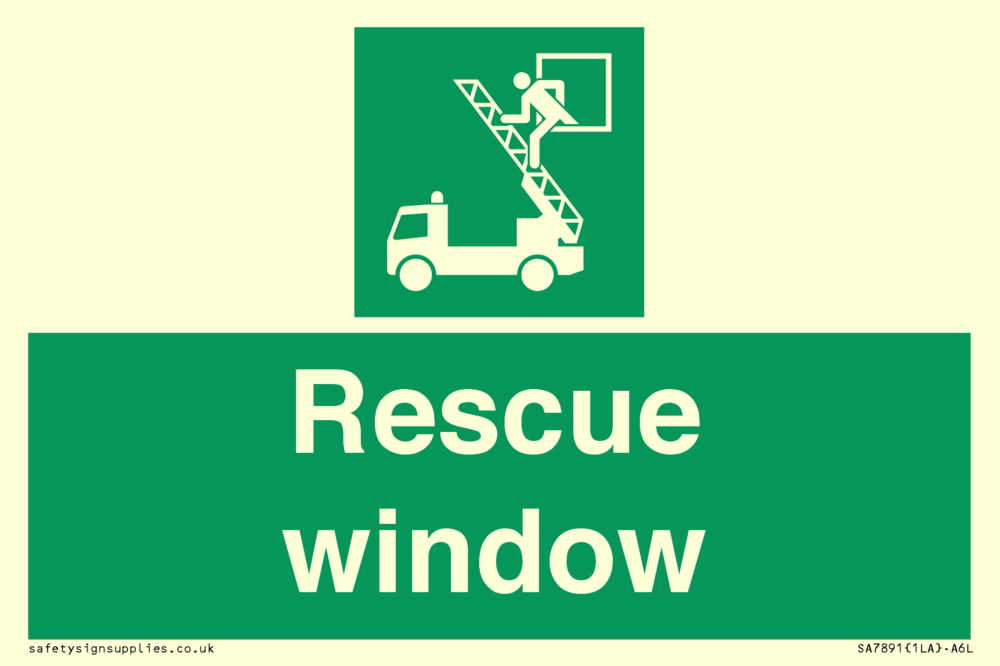 Sign Text: Rescue window Dimensions: 150x100mm Material: Vinyl Photoluminescent sticker Orientation: Landscape Text Colour: White Background Colour: Green More...