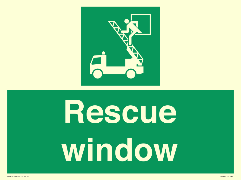 Sign Text: Rescue window Dimensions: 400x300mm Material: Vinyl Photoluminescent sticker Orientation: Landscape Text Colour: White Background Colour: Green More...