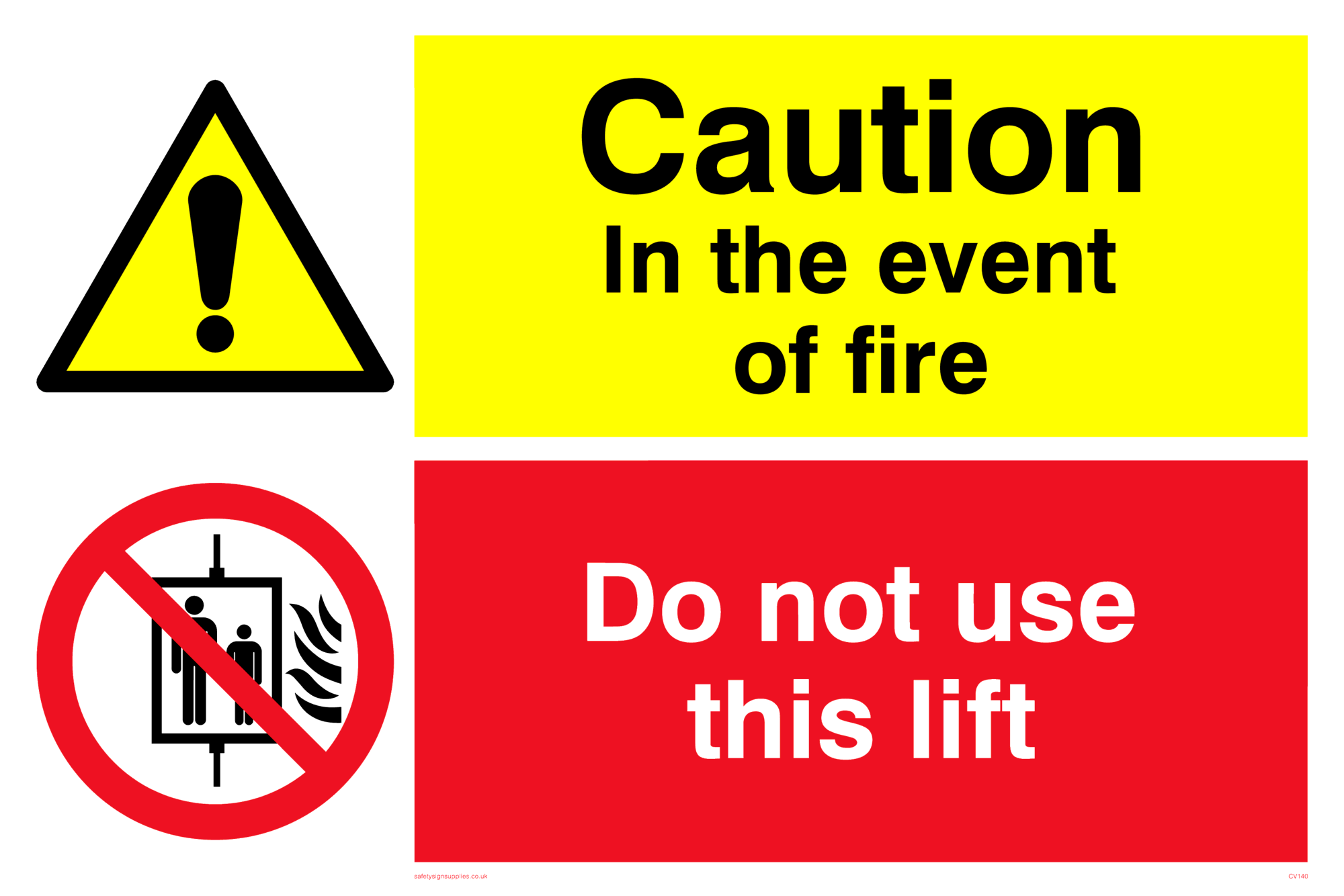 This sign contains a do not use lift symbol. Lift in black within red circle with diagonal line crossed through.
