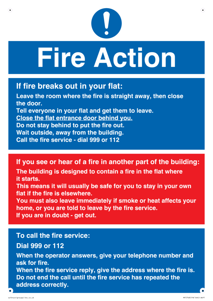 Sign Text: Fire action. If fire breaks out in your flat: Leave the room where the fire is straight away, then close the door. Tell everyone in your flat and get them to leave. Close the flat entrance door behind you. Do not stay behind to put the fire out. Wait outside, away from the building. Call the fire service - dial 999 or 112. If you see or hear a fire in another part of the building: The building is designed to contain a fire in the flat where it starts. This means it will usually be safe for you to stay in your own flat if the fire is elsewhere. You must also leave immediately if smoke or heat affects your home, or you are told to leave by the fire service. If you are in doubt - get out. To call the fire service: Dial 999 or 112. When the operator answers, give your telephone number and ask for fire. When the fire service reply, give the address where the fire is. Do not end the call until the fire service has repeated the address correctly.