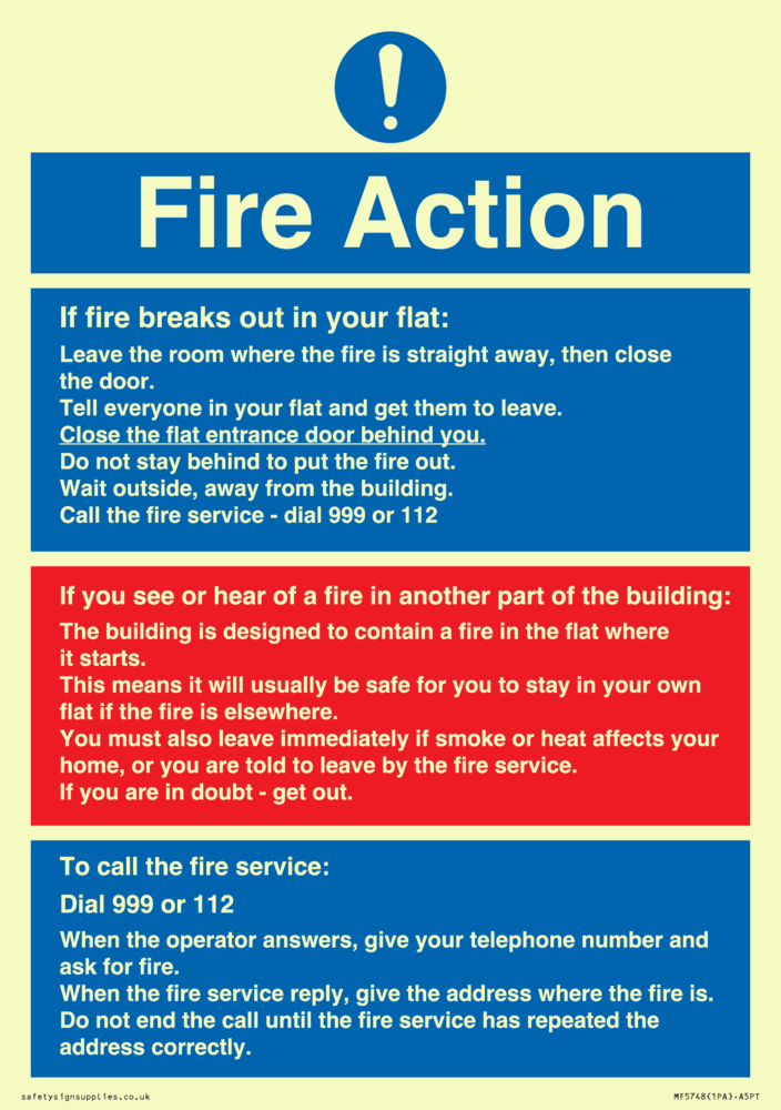Sign Text: Fire action. If fire breaks out in your flat: Leave the room where the fire is straight away, then close the door. Tell everyone in your flat and get them to leave. Close the flat entrance door behind you. Do not stay behind to put the fire out. Wait outside, away from the building. Call the fire service - dial 999 or 112. If you see or hear a fire in another part of the building: The building is designed to contain a fire in the flat where it starts. This means it will usually be safe for you to stay in your own flat if the fire is elsewhere. You must also leave immediately if smoke or heat affects your home, or you are told to leave by the fire service. If you are in doubt - get out. To call the fire service: Dial 999 or 112. When the operator answers, give your telephone number and ask for fire. When the fire service reply, give the address where the fire is. Do not end the call until the fire service has repeated the address correctly.