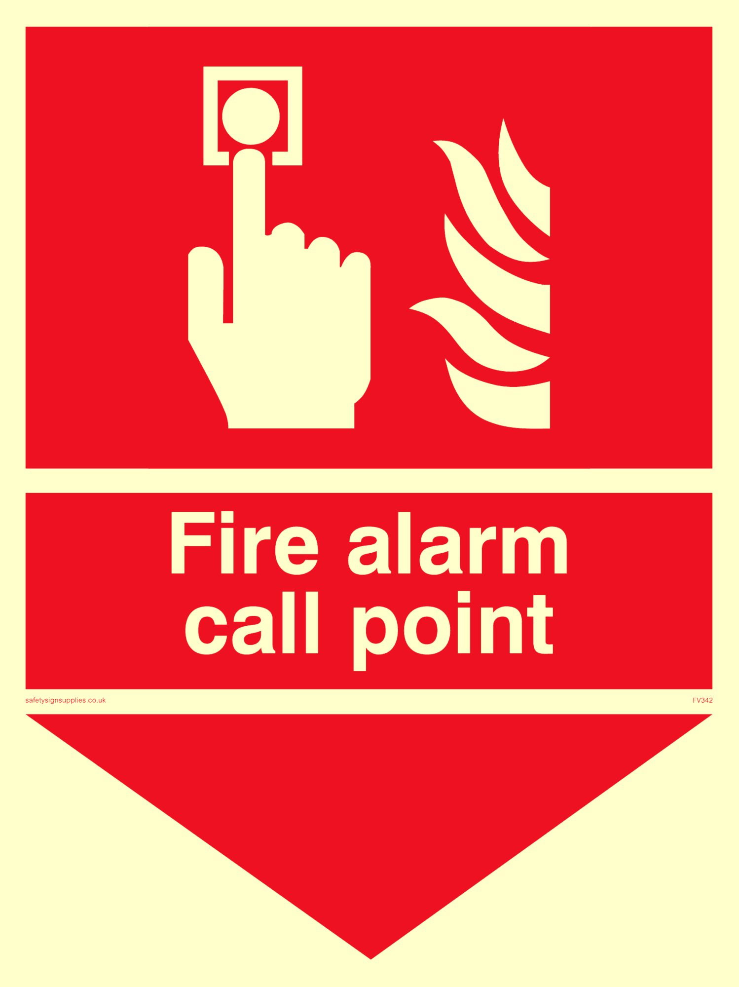 This sign contains a fire alarm call point symbol - finger pressing button in white on red background.