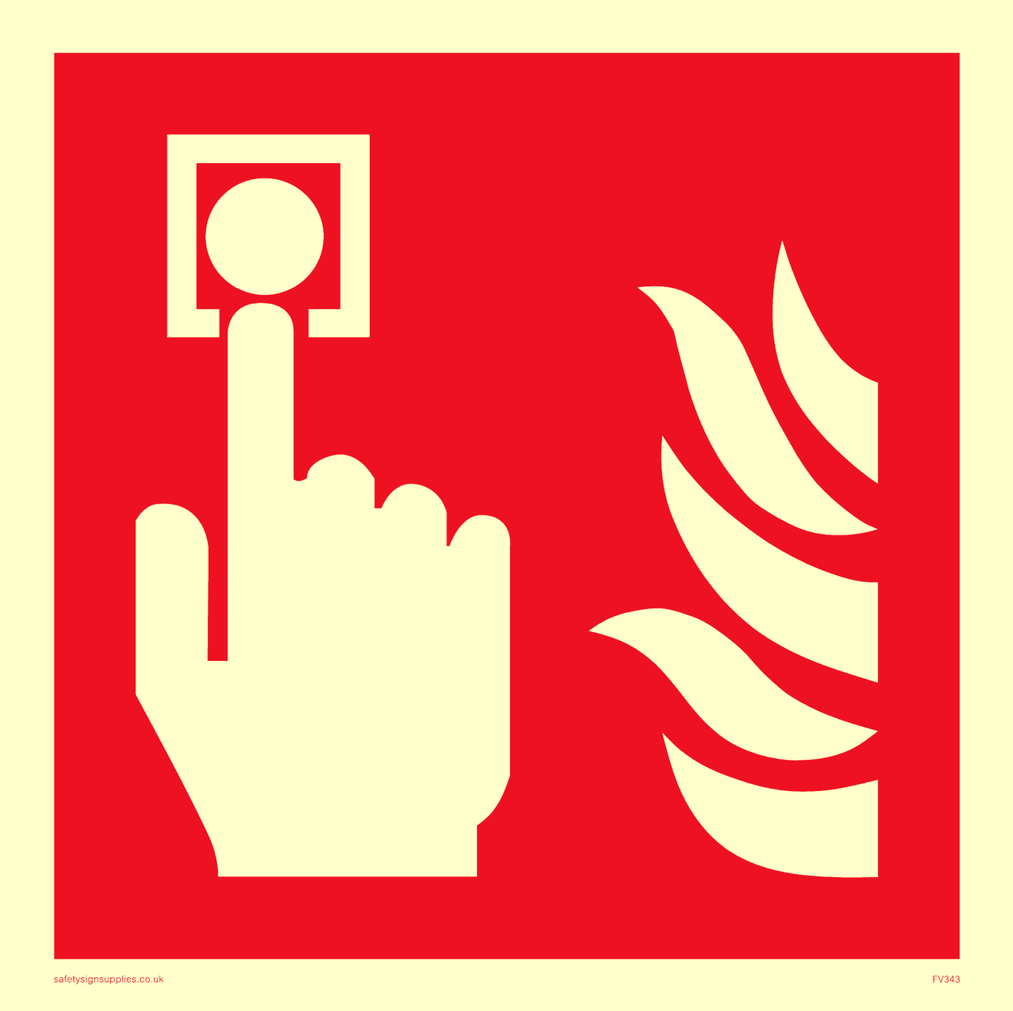 This sign contains a fire alarm call point symbol - finger pressing button in white on red background.