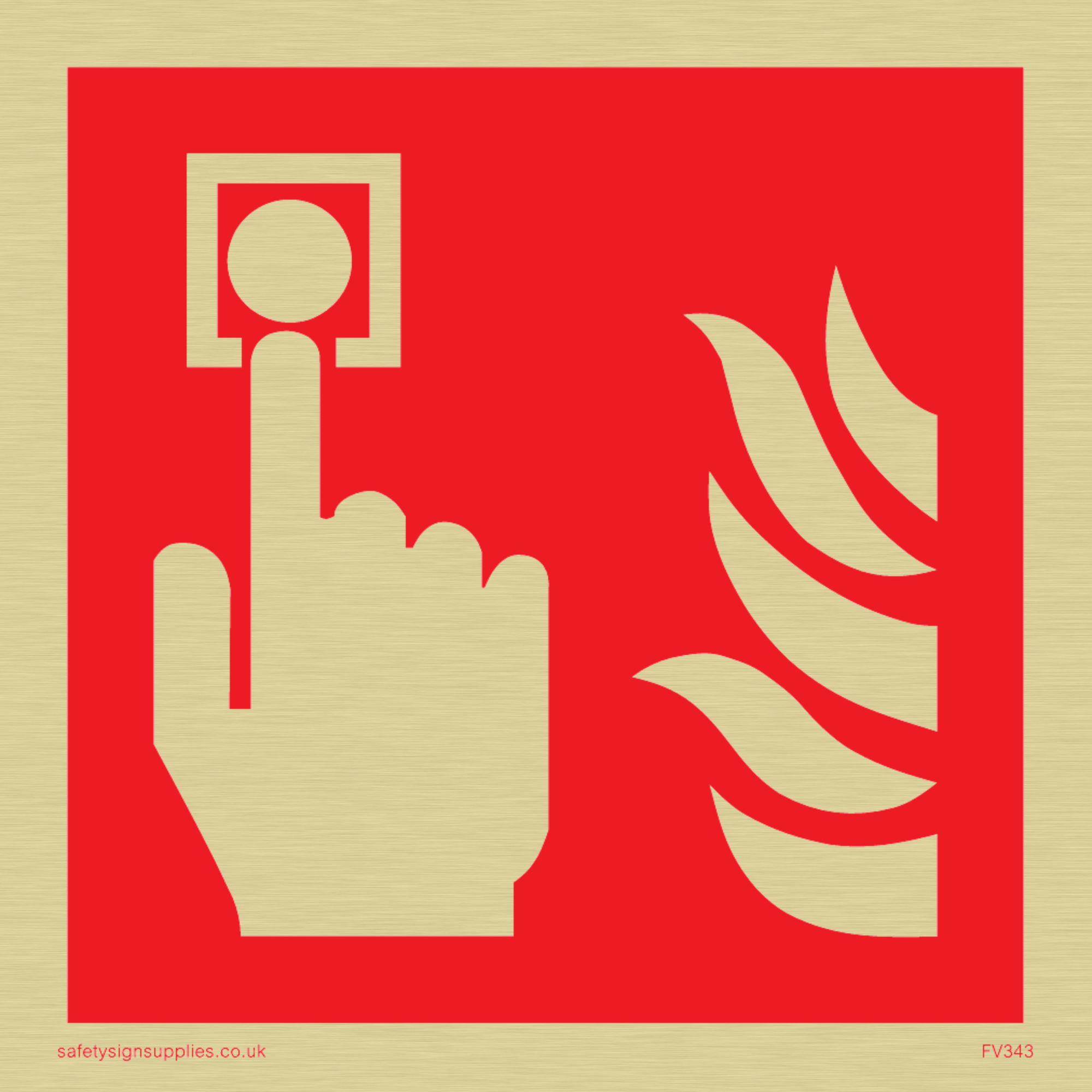 This sign contains a fire alarm call point symbol - finger pressing button in white on red background.