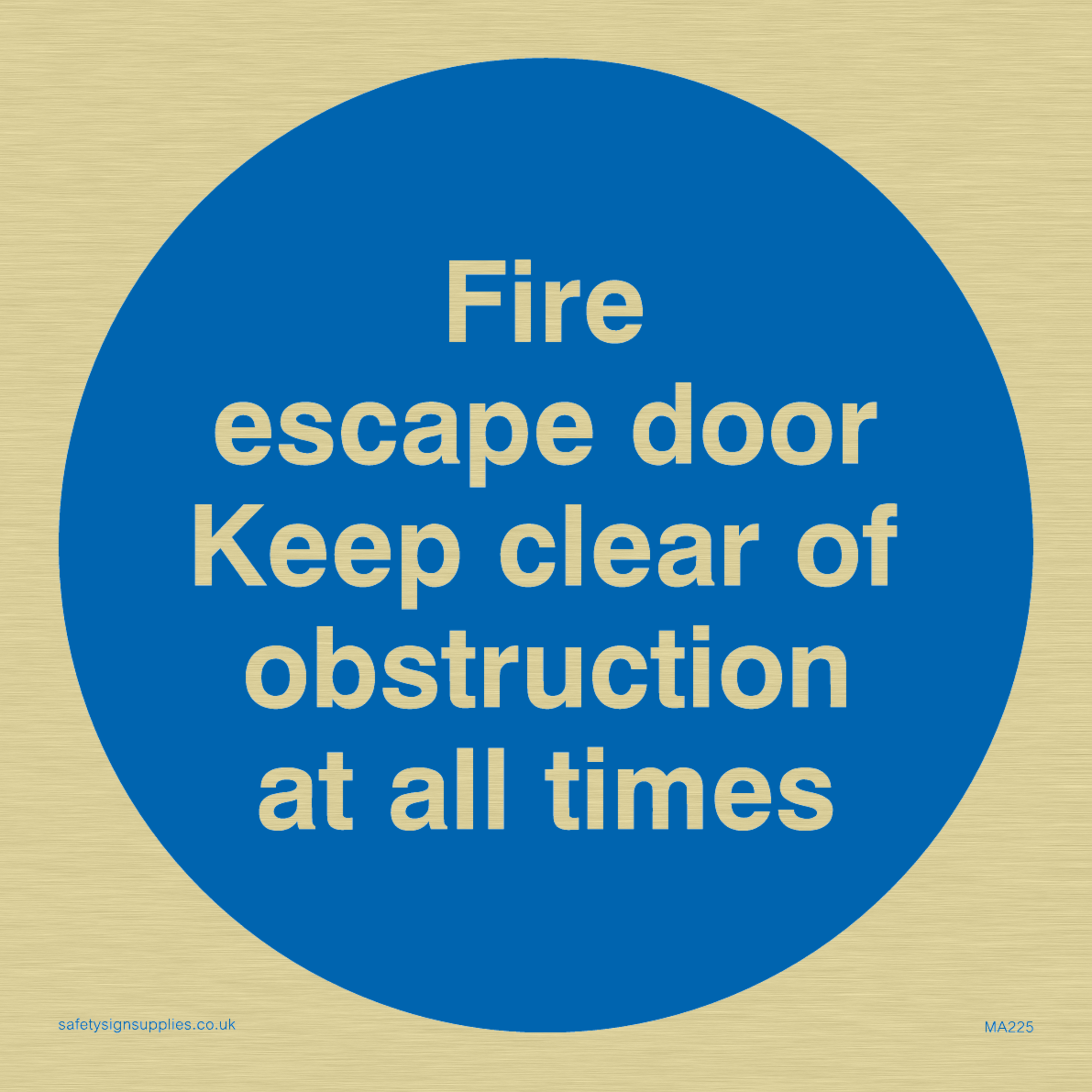 Fire door signs are used on a fire door or emergency door to indicate conditions of use. Keep clear signs indicate an area of location that must be kept clear. Fire escape signs give information relating to fire escape locations or modes of use.