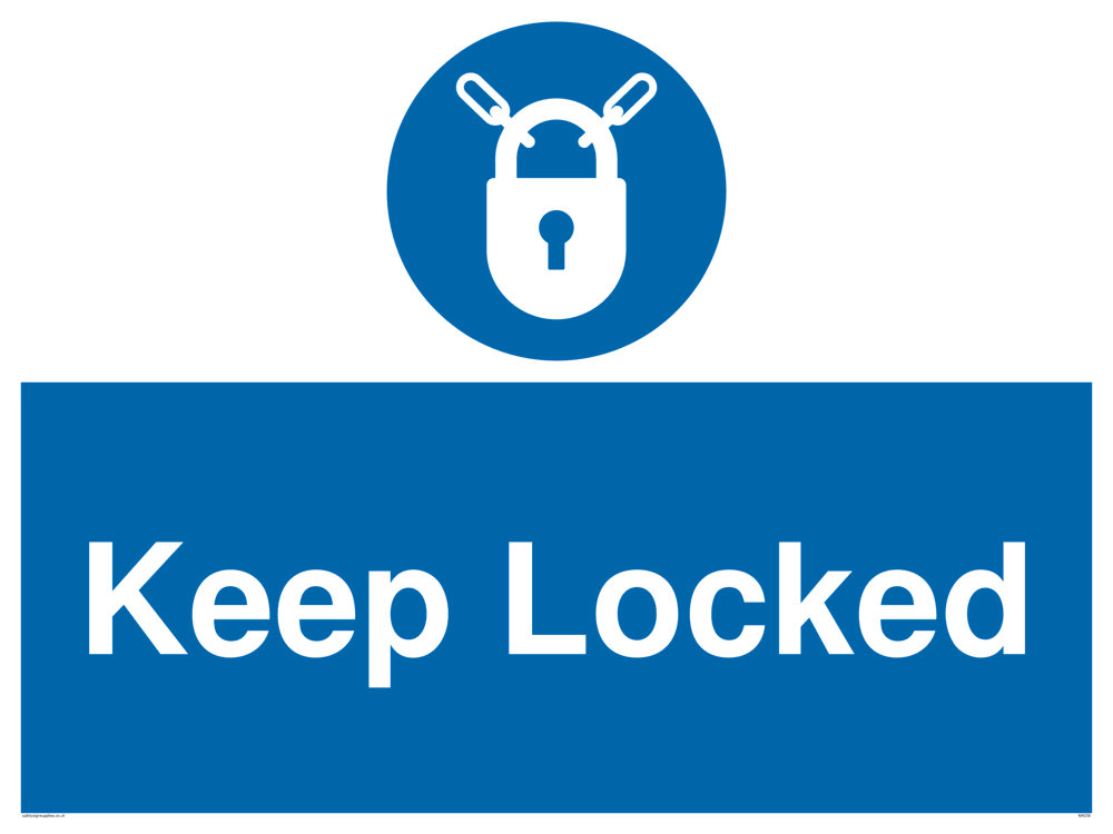 This sign contains a lock required symbol. Padlock in white within a blue circle.