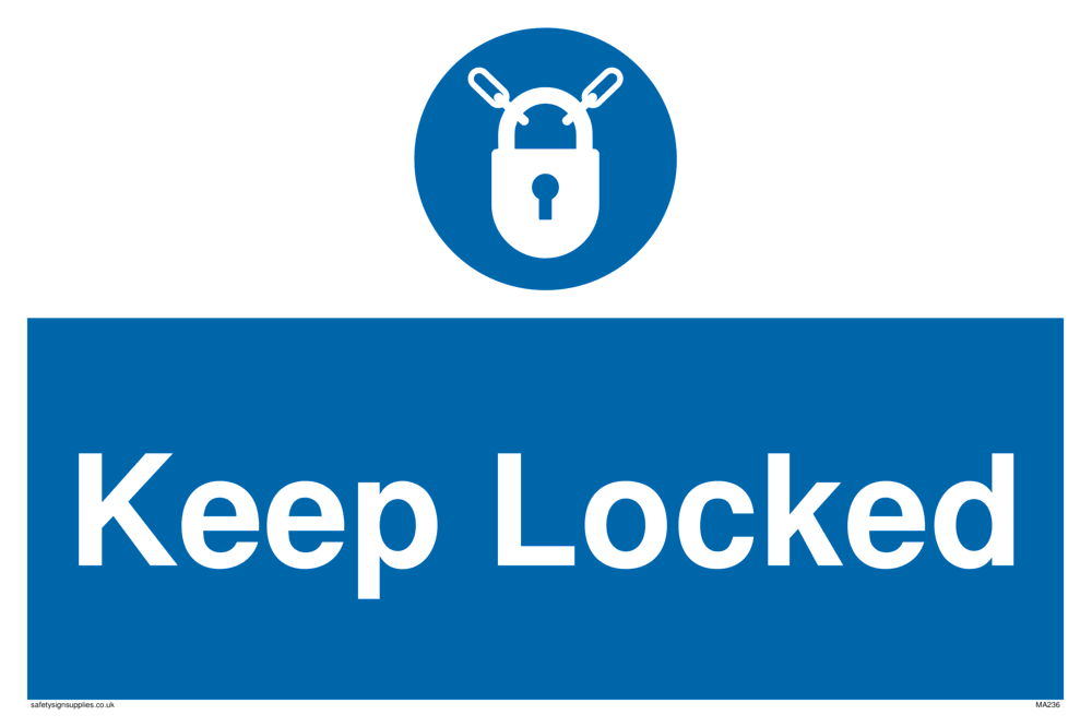 This sign contains a lock required symbol. Padlock in white within a blue circle.