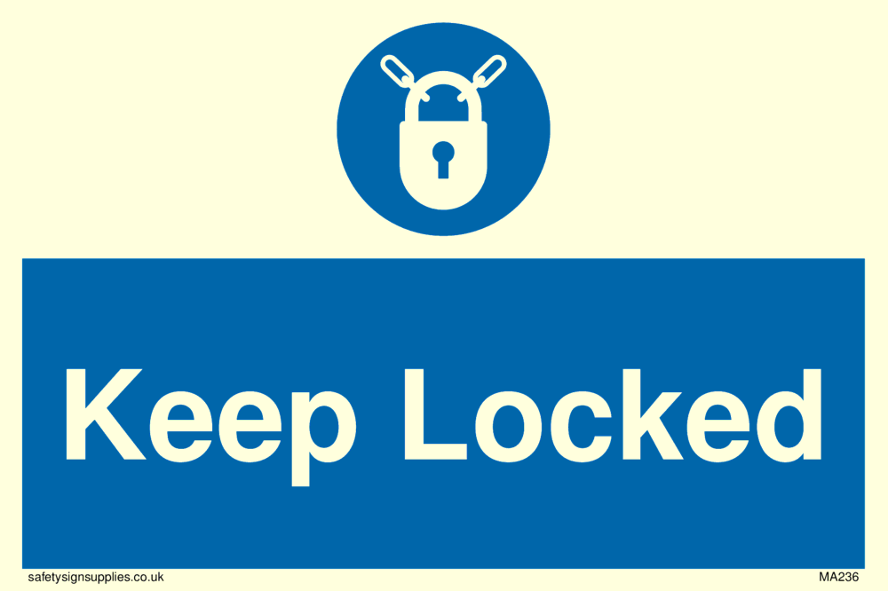 This sign contains a lock required symbol. Padlock in white within a blue circle. Comes with a self adhesive backing.