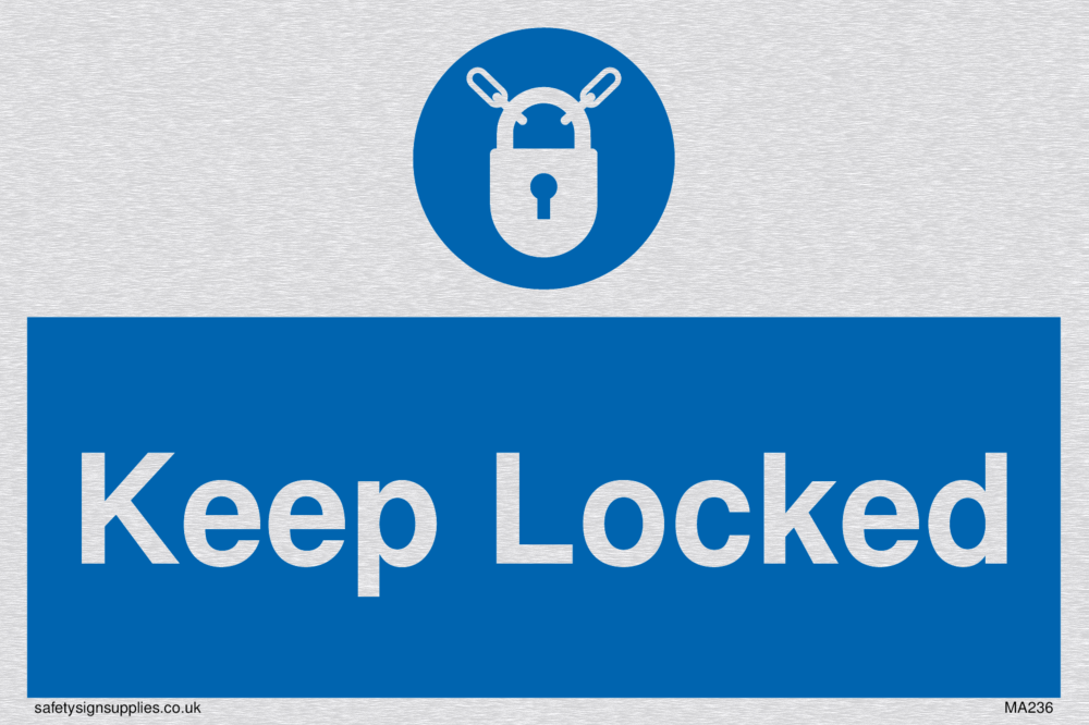 This sign contains a lock required symbol. Padlock in white within a blue circle. Suitable for hanging with a budget hanging kit. Suitable for fixing with screws.