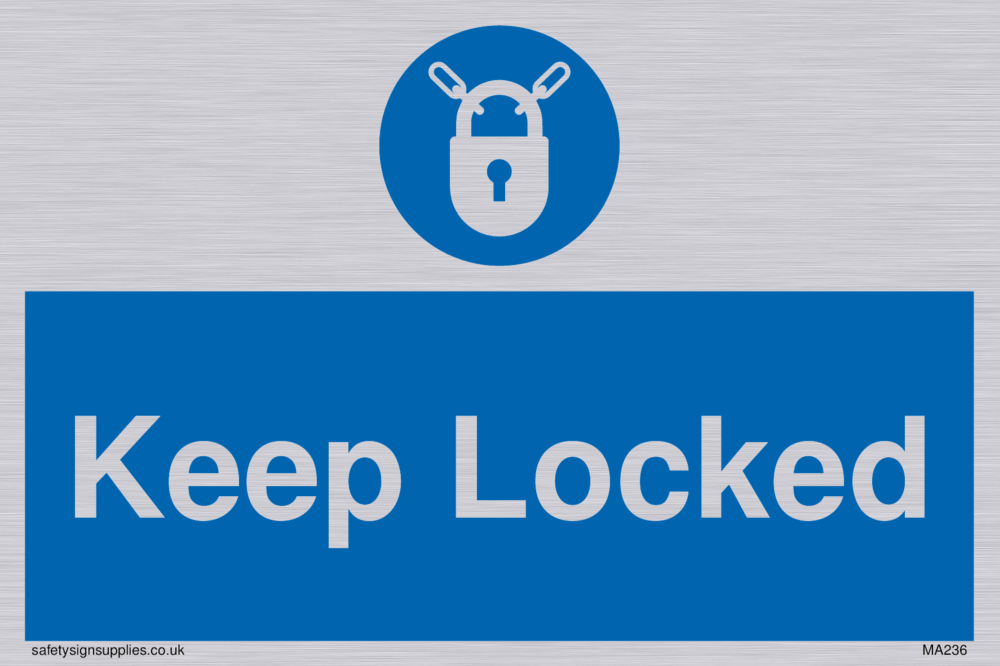 This sign contains a lock required symbol. Padlock in white within a blue circle. Comes with a self adhesive backing. 100mm or approximately 4" high.