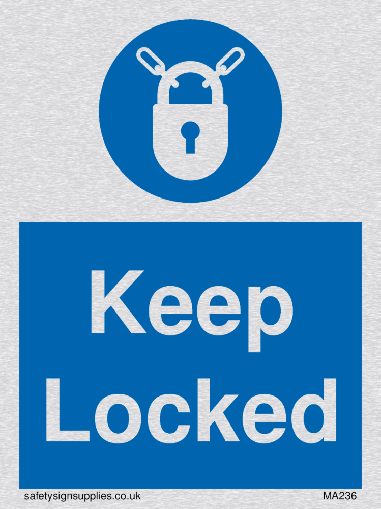 This sign contains a lock required symbol. Padlock in white within a blue circle. Suitable for hanging with a budget hanging kit. Suitable for fixing with screws.
