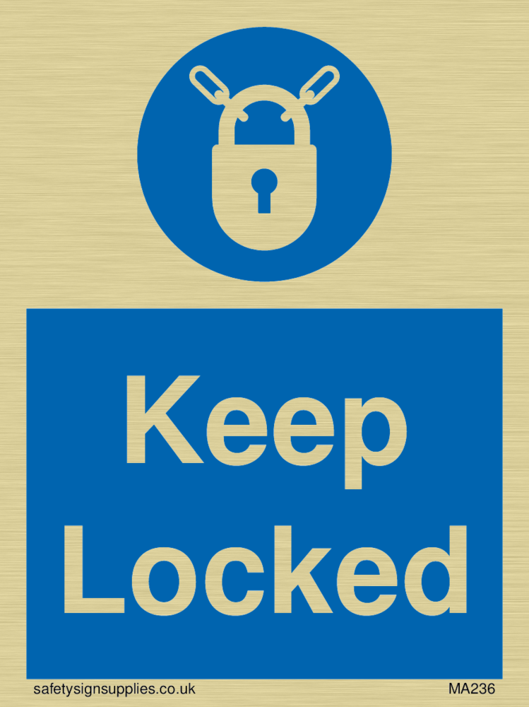 This sign contains a lock required symbol. Padlock in white within a blue circle. Comes with a self adhesive backing. 100mm or approximately 4" high.