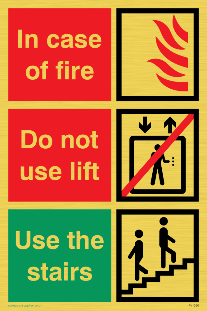 White background with white text in red and green boxes. Flames, do not use lift and use the stairs symbols.