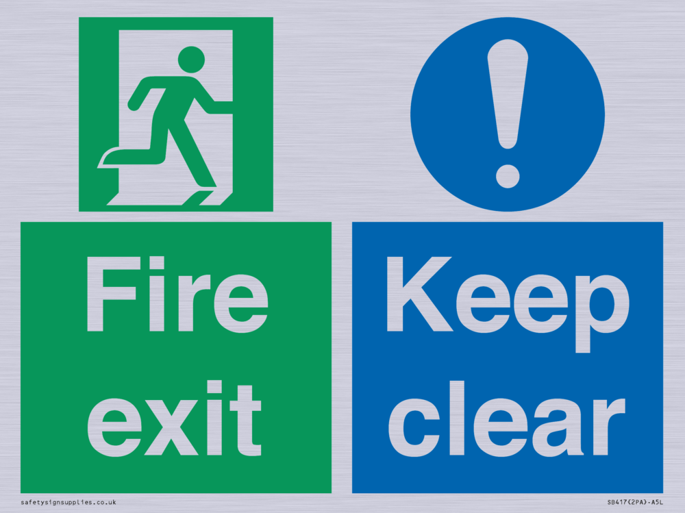 Fire Exit Keep Clear dual safety sign: running man facing right and exclamation in blue circle