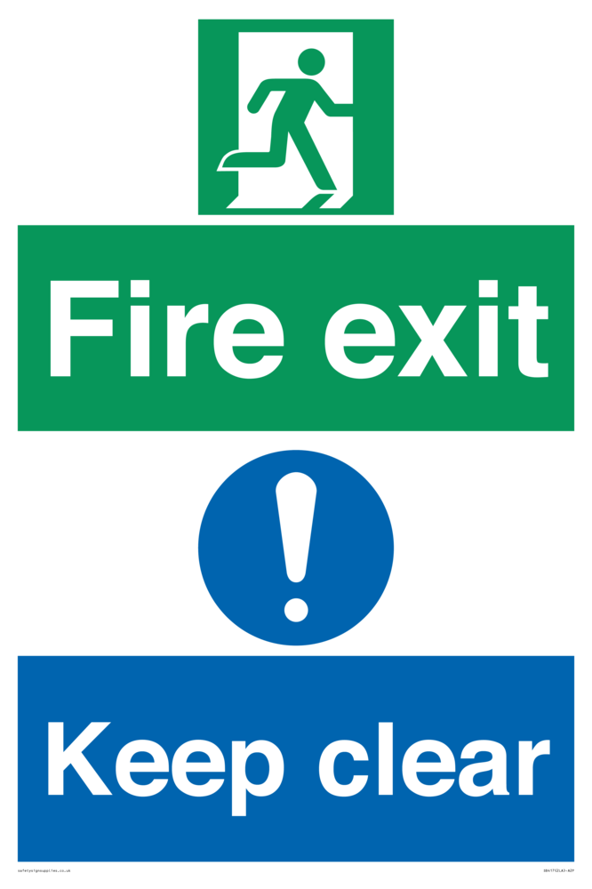 Fire Exit Keep Clear dual safety sign: running man facing right and exclamation in blue circle