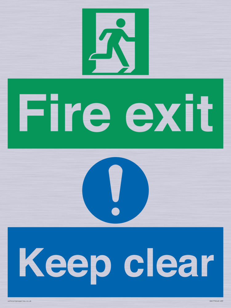 Fire Exit Keep Clear dual safety sign: running man facing right and exclamation in blue circle